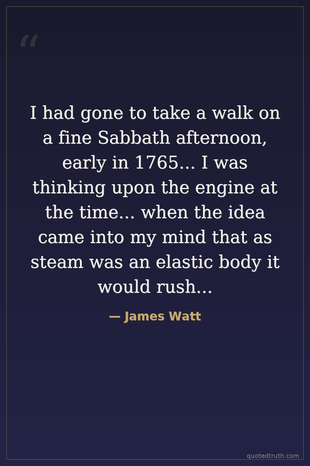 I had gone to take a walk on a fine Sabbath afternoon, early in 1765... I was thinking upon the engine at the time... when the idea came into my mind that as steam was an elastic body it would rush into a vacuum, and if a communication were made between the cylinder and an exhausted vessel it would rush into it, and might be there condensed without cooling the cylinder.