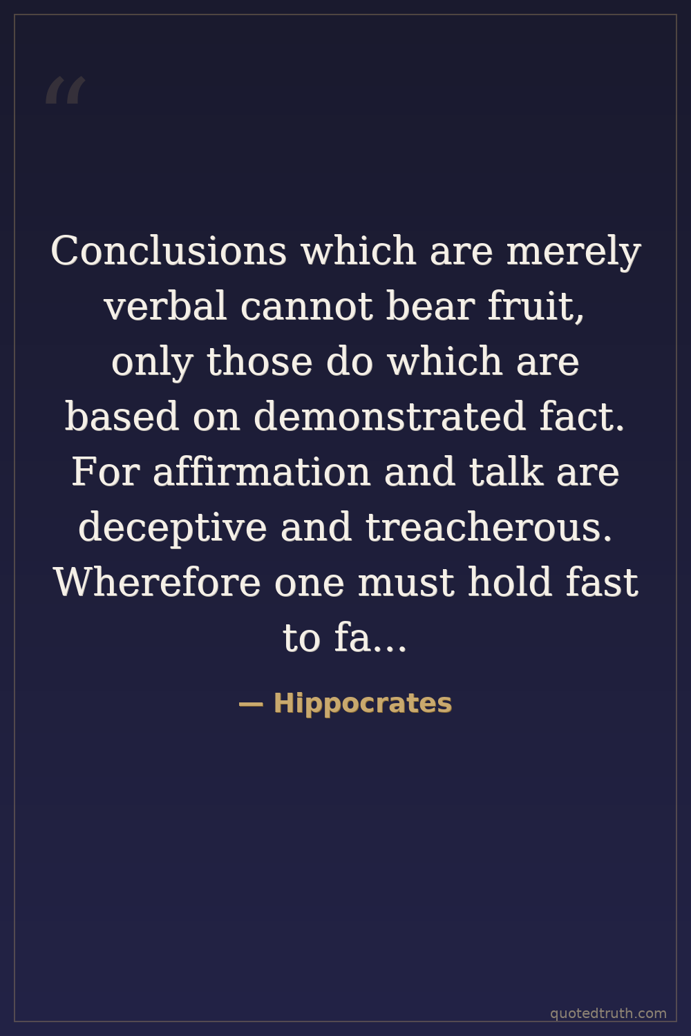 Conclusions which are merely verbal cannot bear fruit, only those do which are based on demonstrated fact. For affirmation and talk are deceptive and treacherous. Wherefore one must hold fast to facts in generalizations also, and occupy oneself with facts persistently, if one is to acquire that ready and infallible habit which we call 'the art of medicine'.