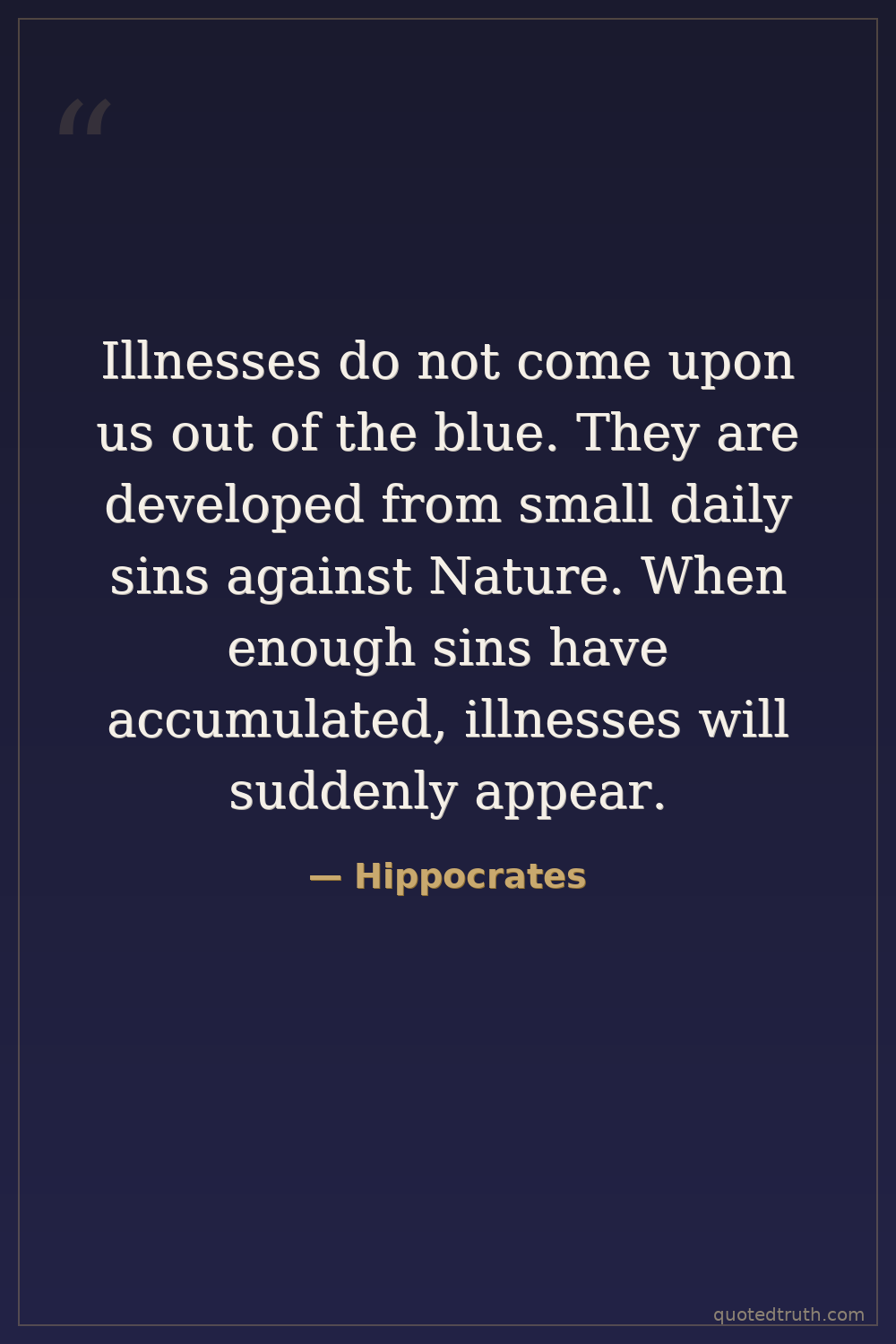 Illnesses do not come upon us out of the blue. They are developed from small daily sins against Nature. When enough sins have accumulated, illnesses will suddenly appear.