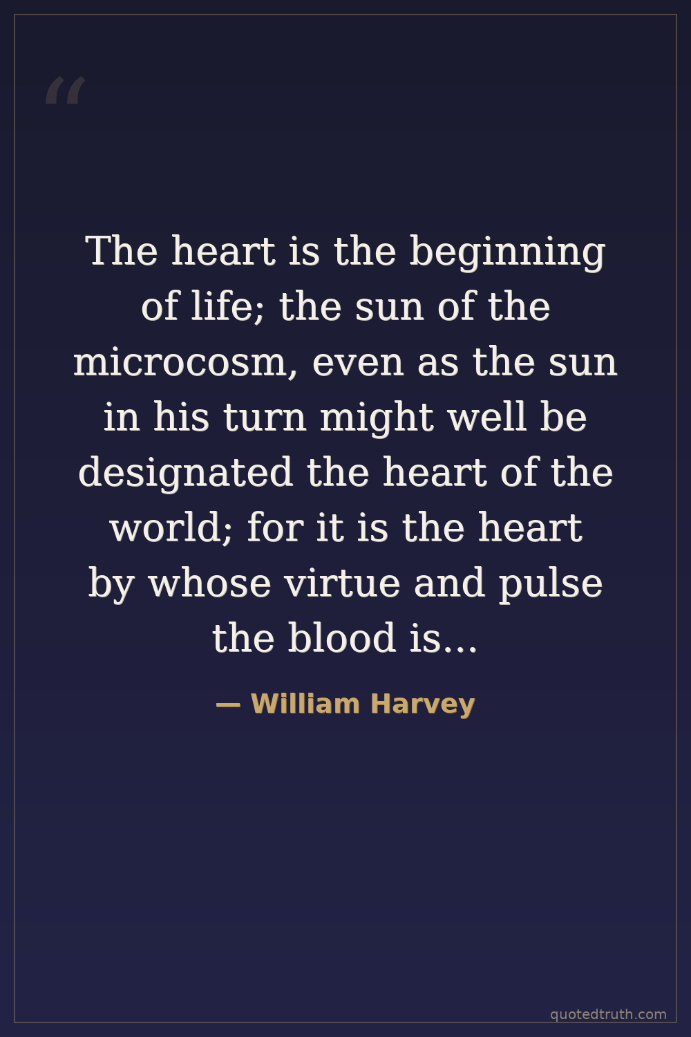 The heart is the beginning of life; the sun of the microcosm, even as the sun in his turn might well be designated the heart of the world; for it is the heart by whose virtue and pulse the blood is moved, perfected, made apt to nourish, and is preserved from corruption and coagulation; it is the household divinity which, discharging its function, nourishes, cherishes, quickens the whole body, and is indeed the foundation of life, the source of all action.