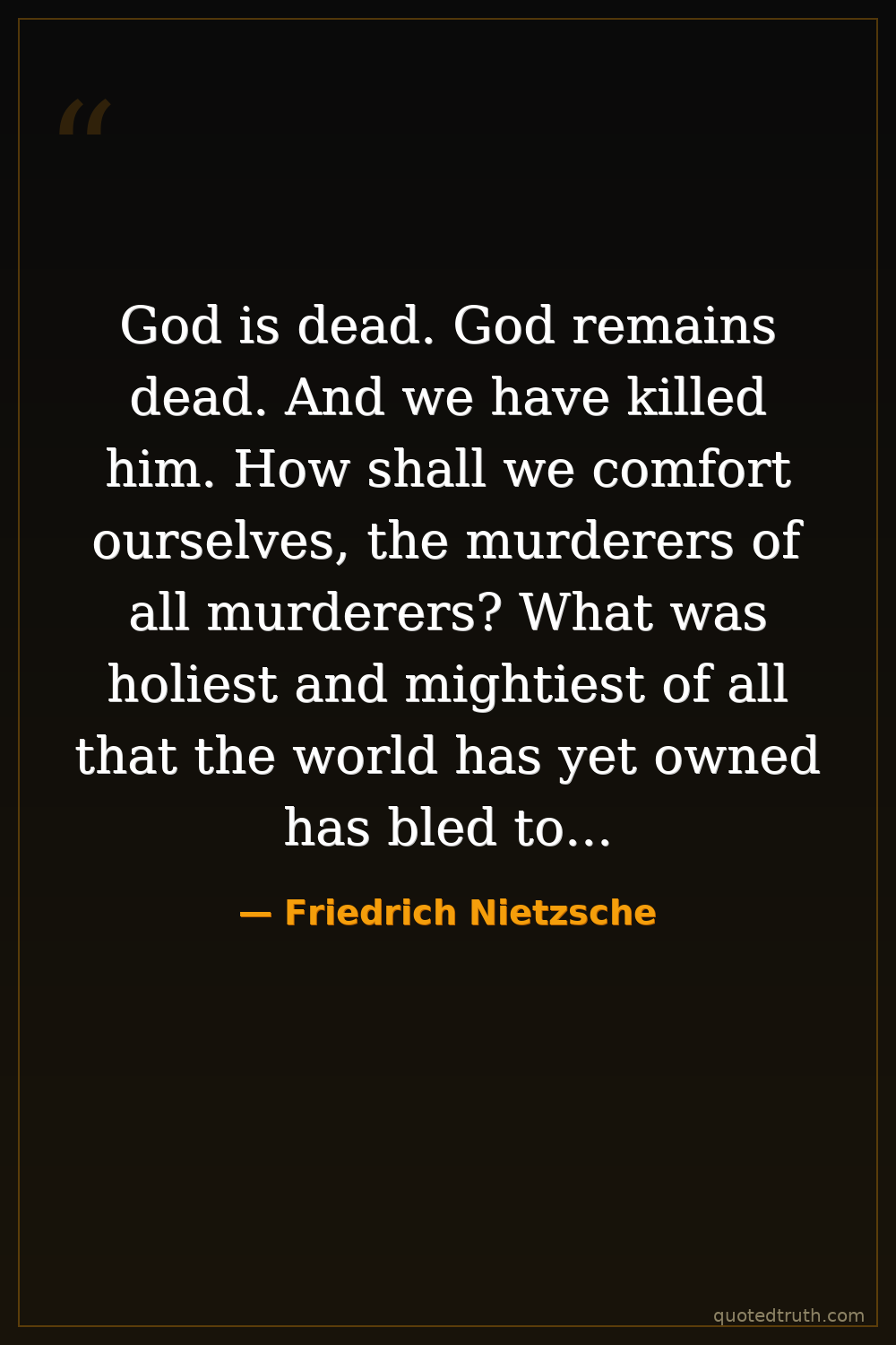 God is dead. God remains dead. And we have killed him. How shall we comfort ourselves, the murderers of all murderers? What was holiest and mightiest of all that the world has yet owned has bled to death under our knives: who will wipe this blood off us? What water is there for us to cleanse ourselves? What festivals of atonement, what sacred games shall we have to invent? Is not the greatness of this deed too great for us? Must we ourselves not become gods simply to appear worthy of it?