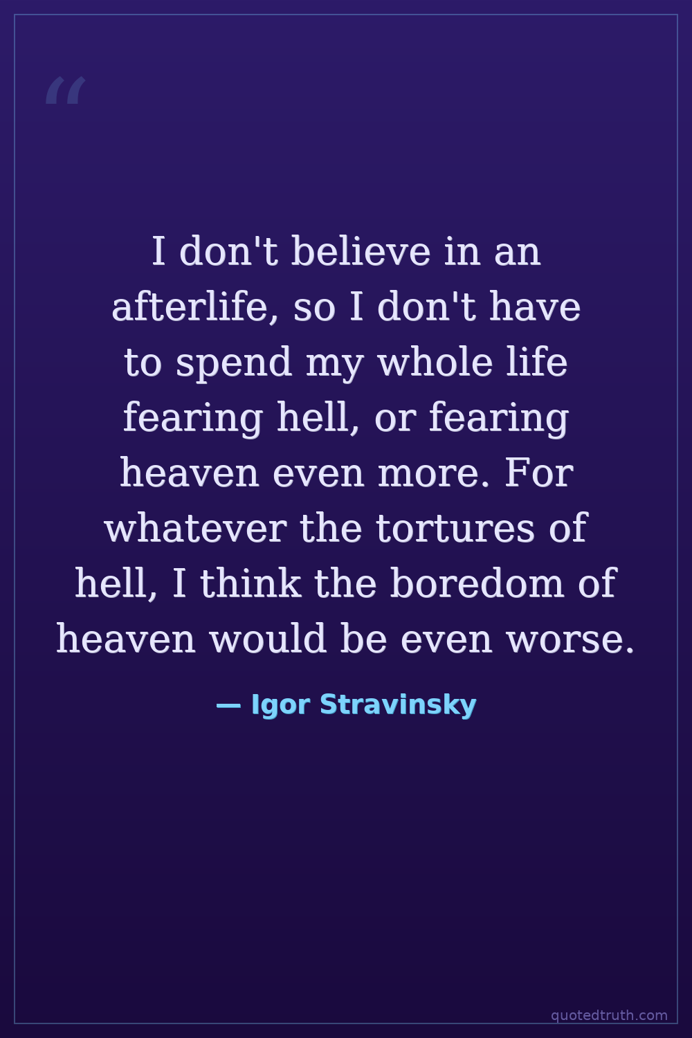 I don't believe in an afterlife, so I don't have to spend my whole life fearing hell, or fearing heaven even more. For whatever the tortures of hell, I think the boredom of heaven would be even worse.