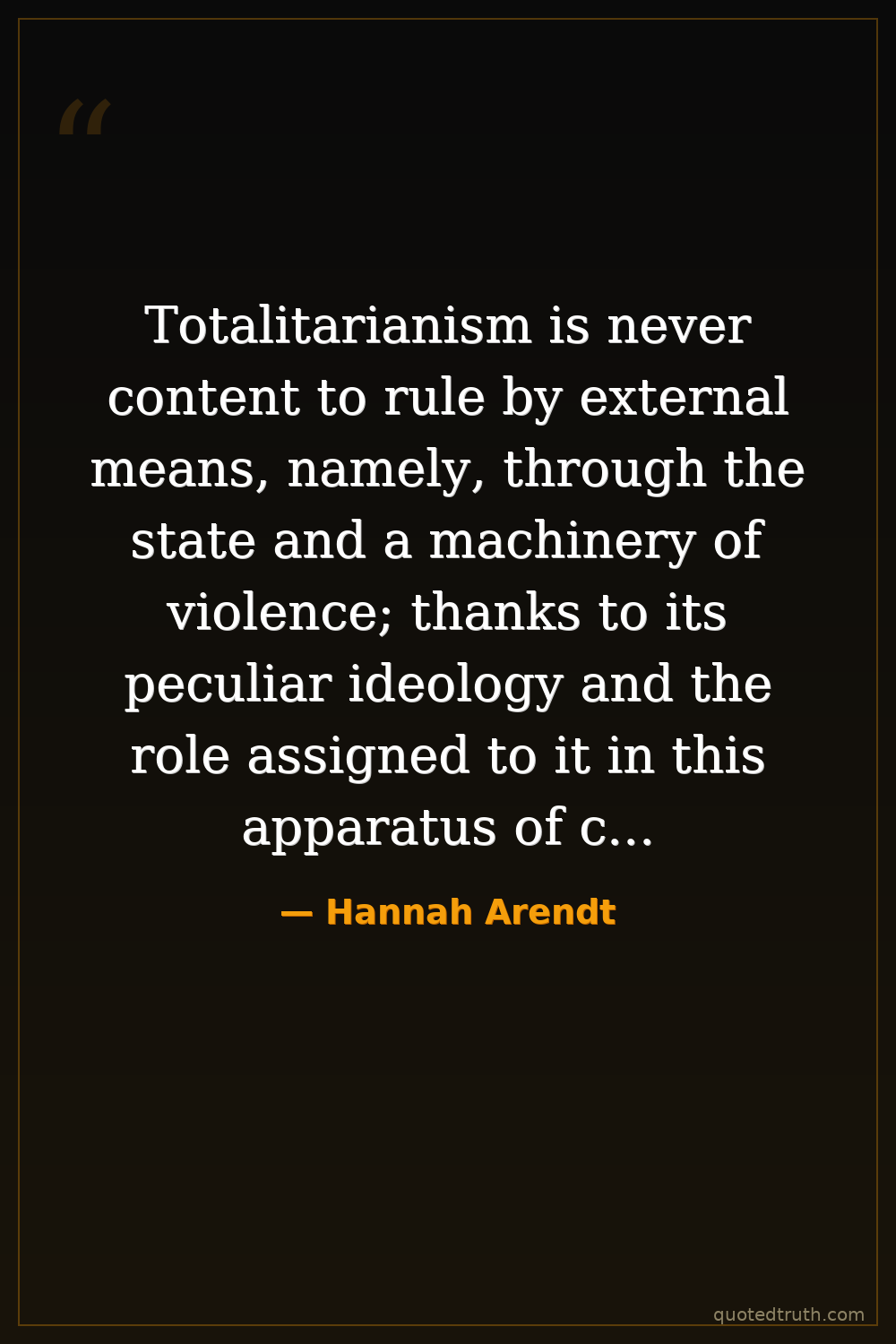 Totalitarianism is never content to rule by external means, namely, through the state and a machinery of violence; thanks to its peculiar ideology and the role assigned to it in this apparatus of coercion, totalitarianism has discovered a means of dominating and terrorizing human beings from within.