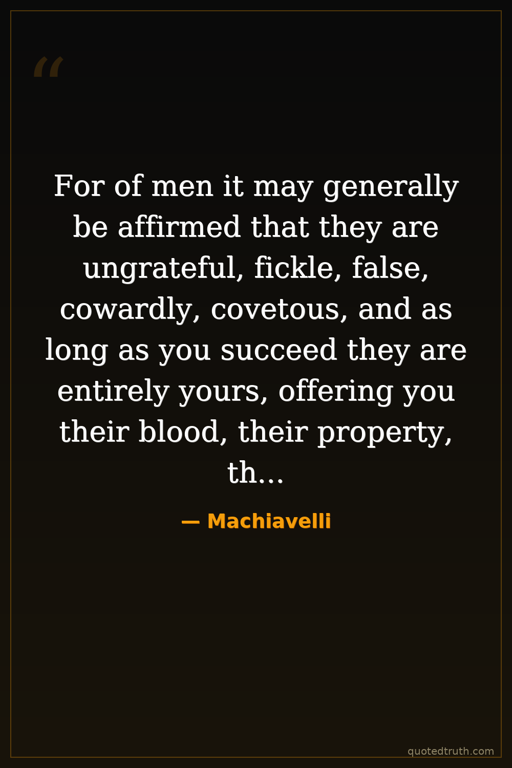 For of men it may generally be affirmed that they are ungrateful, fickle, false, cowardly, covetous, and as long as you succeed they are entirely yours, offering you their blood, their property, their lives, and their sons, as I have before said, when the necessity is remote; but when it approaches nearer to you they turn against you.