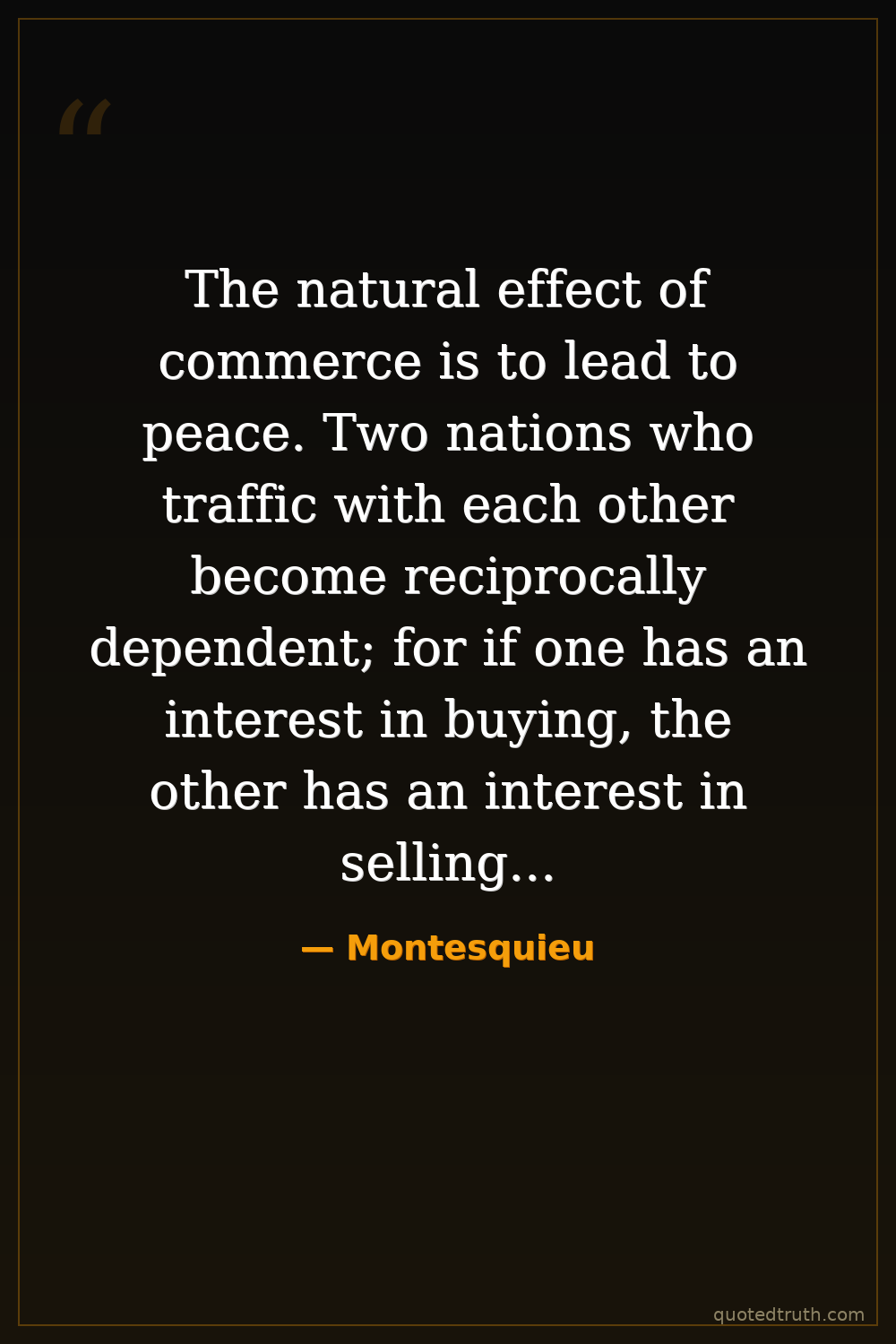 The natural effect of commerce is to lead to peace. Two nations who traffic with each other become reciprocally dependent; for if one has an interest in buying, the other has an interest in selling; and thus their union is founded on their mutual necessities.