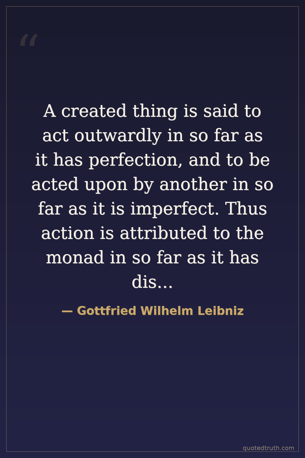 A created thing is said to act outwardly in so far as it has perfection, and to be acted upon by another in so far as it is imperfect. Thus action is attributed to the monad in so far as it has distinct perceptions, and passion or passivity is attributed in so far as it has confused perceptions.