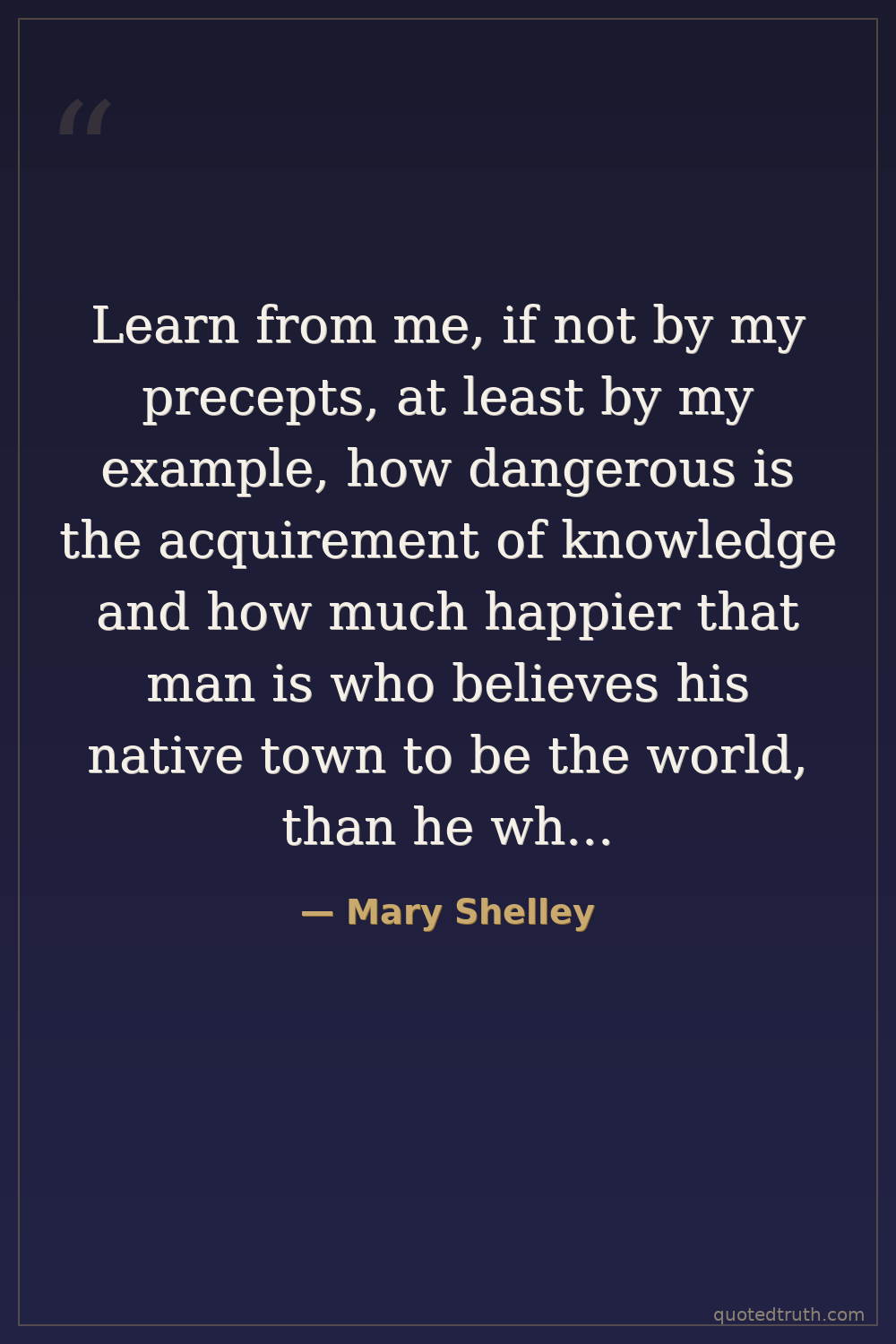 Learn from me, if not by my precepts, at least by my example, how dangerous is the acquirement of knowledge and how much happier that man is who believes his native town to be the world, than he who aspires to become greater than his nature will allow.