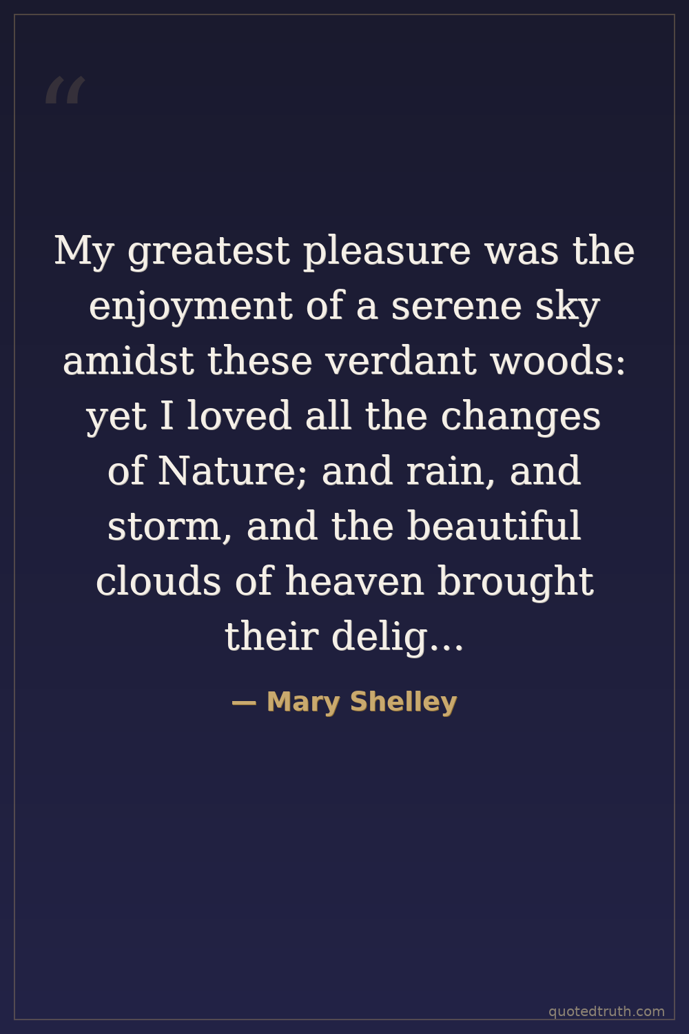 My greatest pleasure was the enjoyment of a serene sky amidst these verdant woods: yet I loved all the changes of Nature; and rain, and storm, and the beautiful clouds of heaven brought their delights with them. When rocked by the waves of the lake my spirits rose in triumph as a horseman feels with pride the motions of his high fed steed.