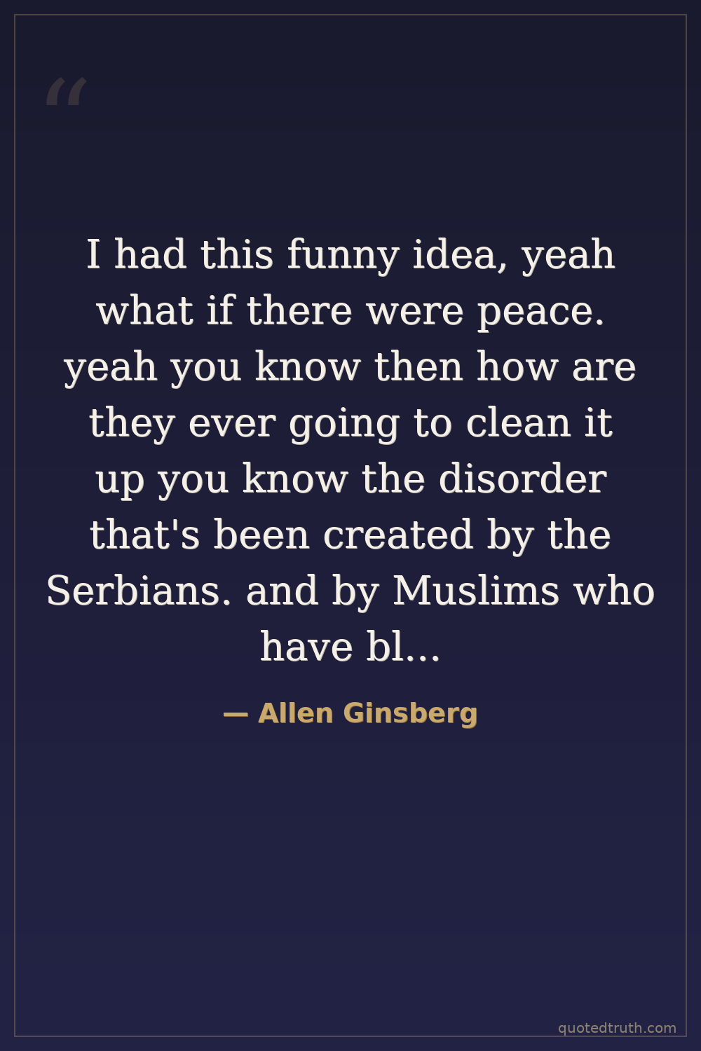 I had this funny idea, yeah what if there were peace. yeah you know then how are they ever going to clean it up you know the disorder that's been created by the Serbians. and by Muslims who have blood on their hands and the Croatians all of them have blood on their hands... who's ever going to disentangle all the confusion rubble that's been created by the war you know they they destroyed law they destroyed families they destroyed communities how's it ever going to get put together again even if there were peace.