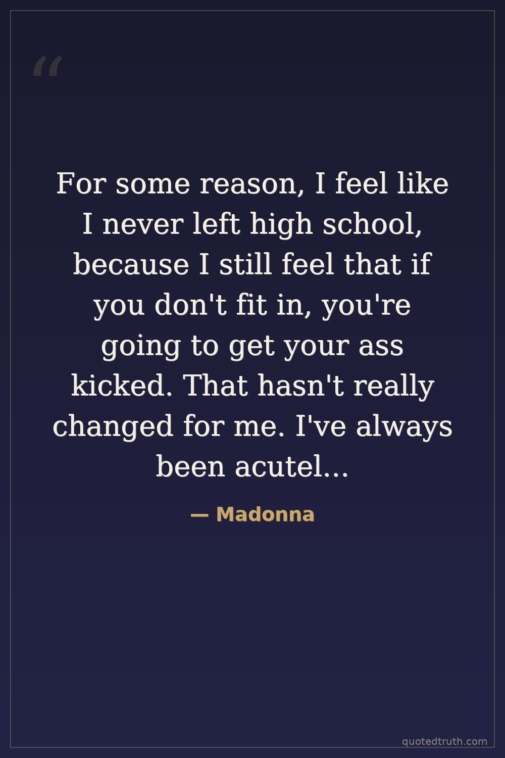 For some reason, I feel like I never left high school, because I still feel that if you don't fit in, you're going to get your ass kicked. That hasn't really changed for me. I've always been acutely aware of differences and the way you are supposed to act if you want to be popular.
