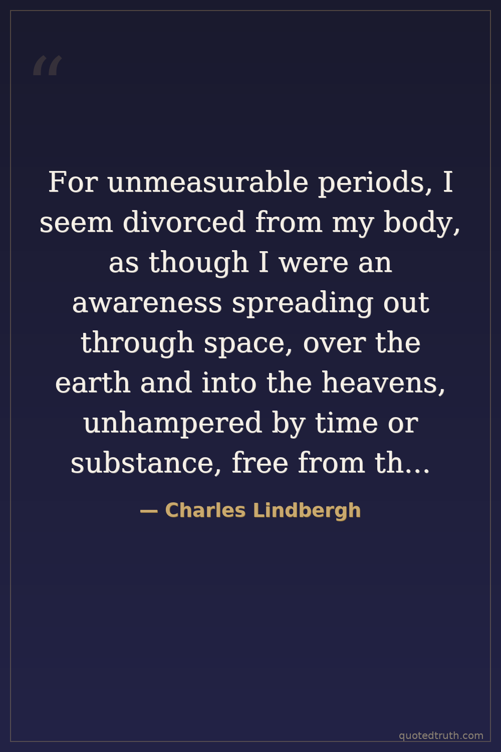 For unmeasurable periods, I seem divorced from my body, as though I were an awareness spreading out through space, over the earth and into the heavens, unhampered by time or substance, free from the gravitation that binds to heavy human problems of the world.