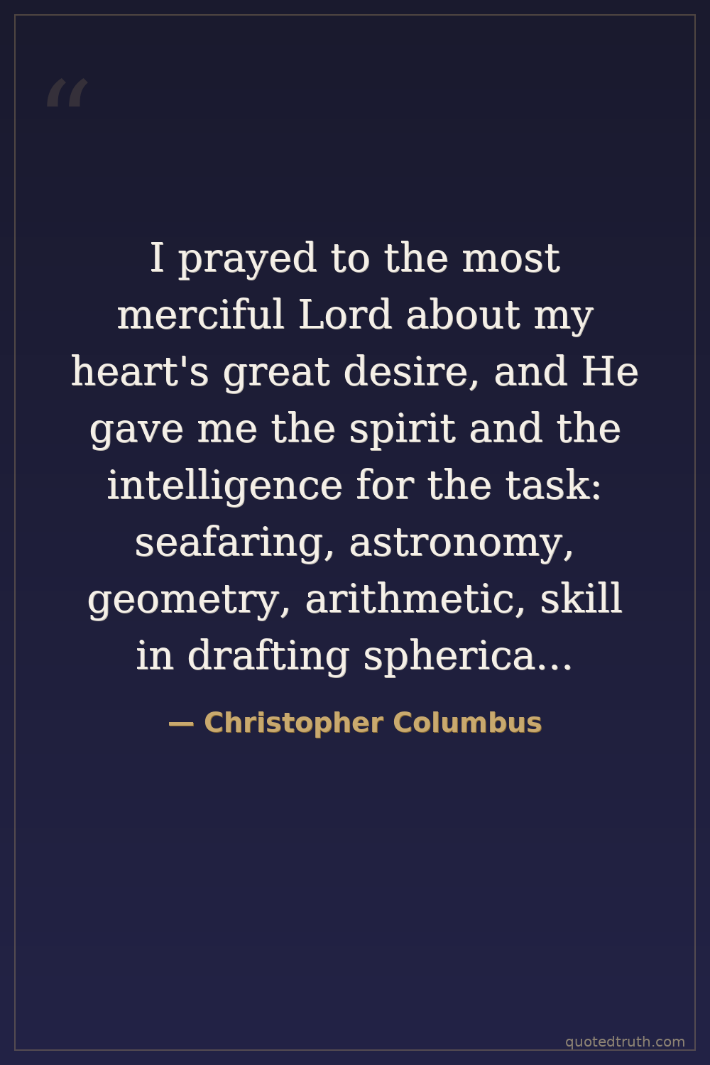 I prayed to the most merciful Lord about my heart's great desire, and He gave me the spirit and the intelligence for the task: seafaring, astronomy, geometry, arithmetic, skill in drafting spherical maps and placing correctly the cities, rivers, mountains and ports. I also studied cosmology, history, chronology and philosophy.
