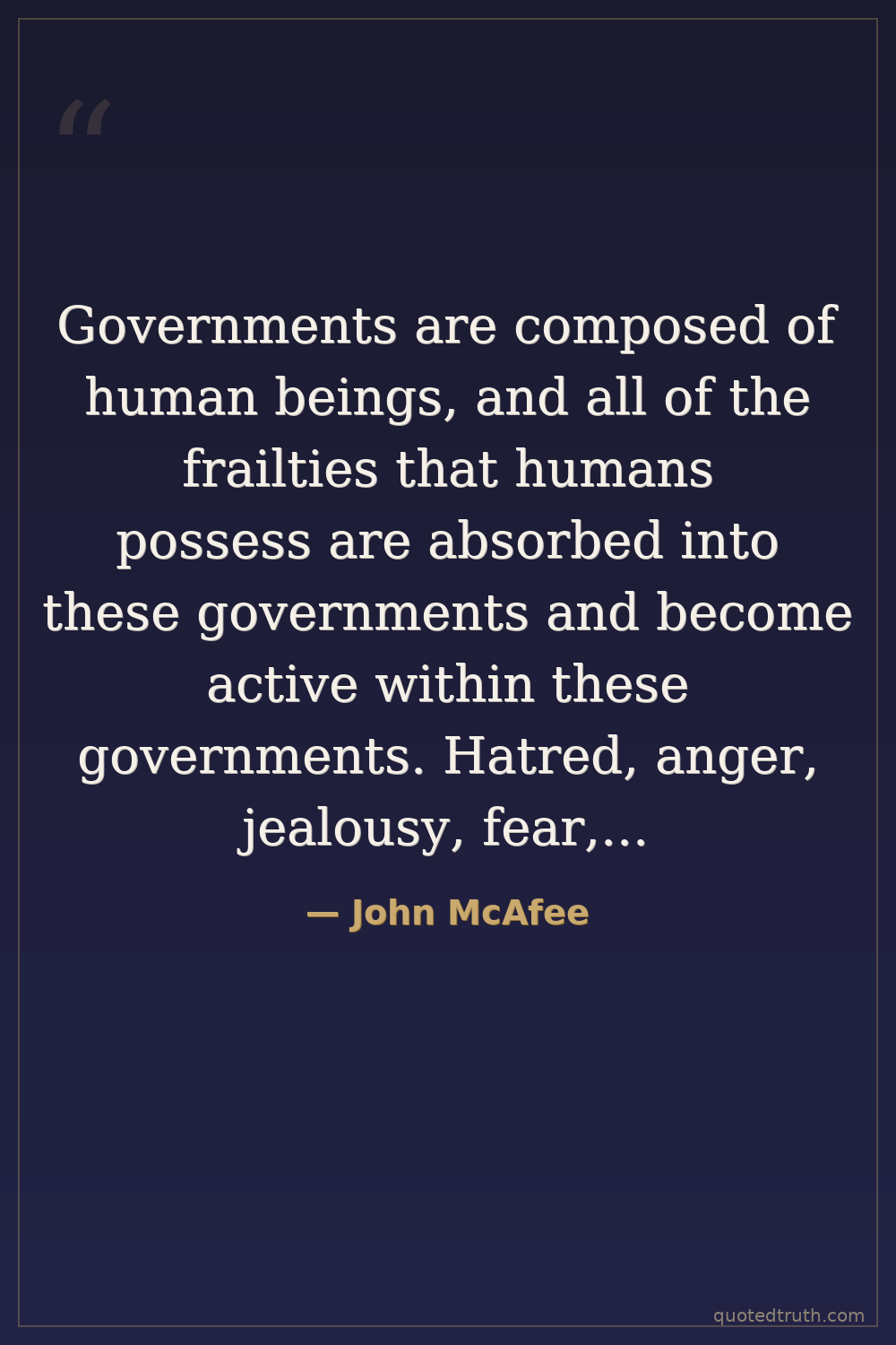 Governments are composed of human beings, and all of the frailties that humans possess are absorbed into these governments and become active within these governments. Hatred, anger, jealousy, fear, greed, distrust and the whole host of afflictions that humans must bear, lurk just beneath the surface of civility displayed by 'government.'