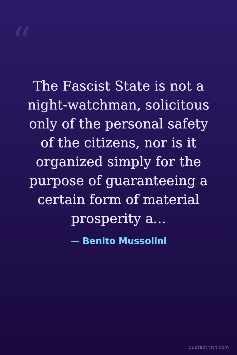 The Fascist State is not a night-watchman, solicitous only of the personal safety of the citizens, nor is it organized simply for the purpose of guaranteeing a certain form of material prosperity and relatively peaceful conditions of life.