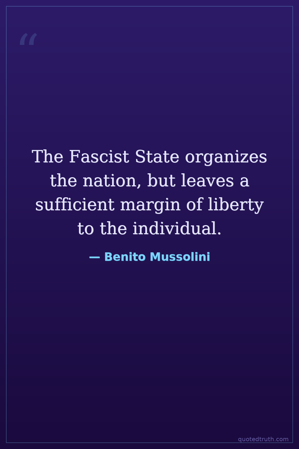 The Fascist State organizes the nation, but leaves a sufficient margin of liberty to the individual.