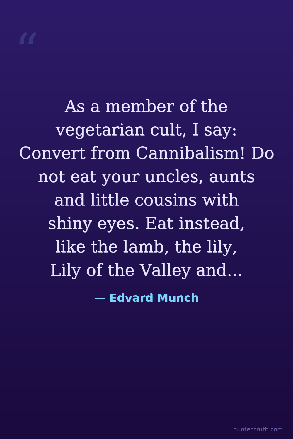 As a member of the vegetarian cult, I say: Convert from Cannibalism! Do not eat your uncles, aunts and little cousins with shiny eyes. Eat instead, like the lamb, the lily, Lily of the Valley and the grass. You are in fact half vegetarian already – Cognac, burgundy wines and champagne are the blood of the grape.