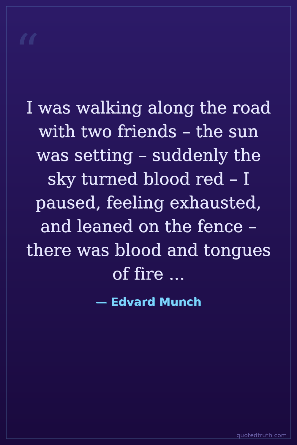 I was walking along the road with two friends – the sun was setting – suddenly the sky turned blood red – I paused, feeling exhausted, and leaned on the fence – there was blood and tongues of fire above the blue-black fjord and the city – my friends walked on, and I stood there trembling with anxiety – and I sensed an infinite scream passing through nature.