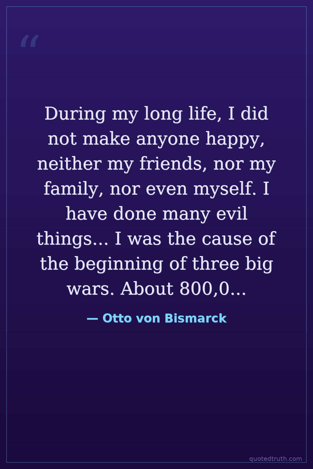 During my long life, I did not make anyone happy, neither my friends, nor my family, nor even myself. I have done many evil things... I was the cause of the beginning of three big wars. About 800,000 people were killed because of me on the battlefields, and their mothers, brothers, and widows cried for them. And now this stands between me and God.