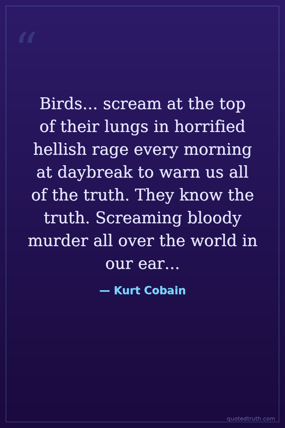 Birds... scream at the top of their lungs in horrified hellish rage every morning at daybreak to warn us all of the truth. They know the truth. Screaming bloody murder all over the world in our ears, but sadly we don't speak bird.