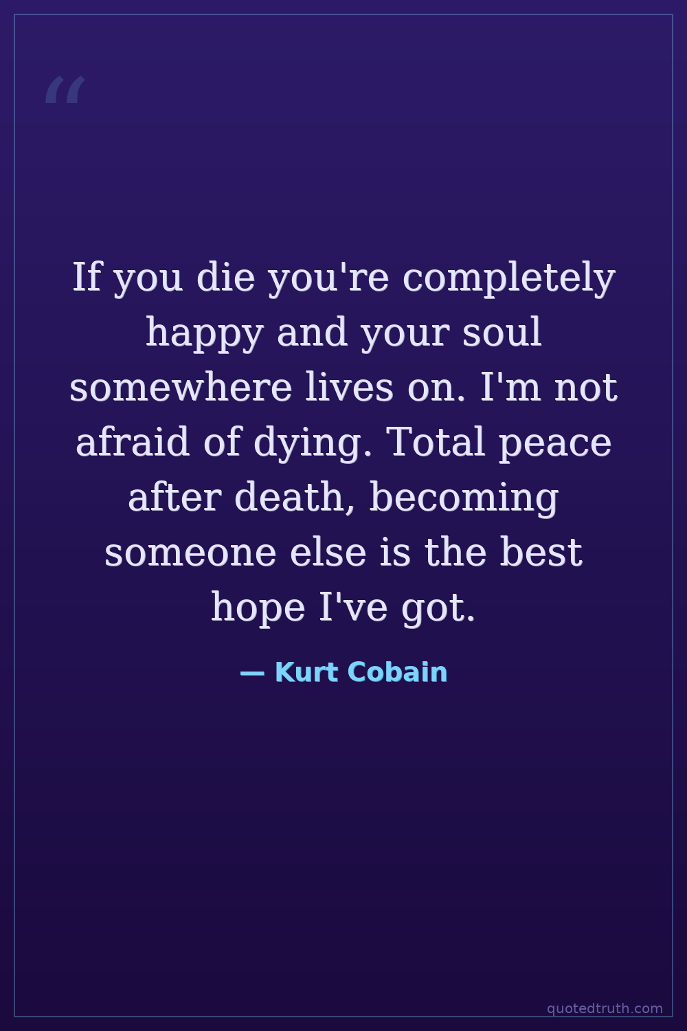 If you die you're completely happy and your soul somewhere lives on. I'm not afraid of dying. Total peace after death, becoming someone else is the best hope I've got.