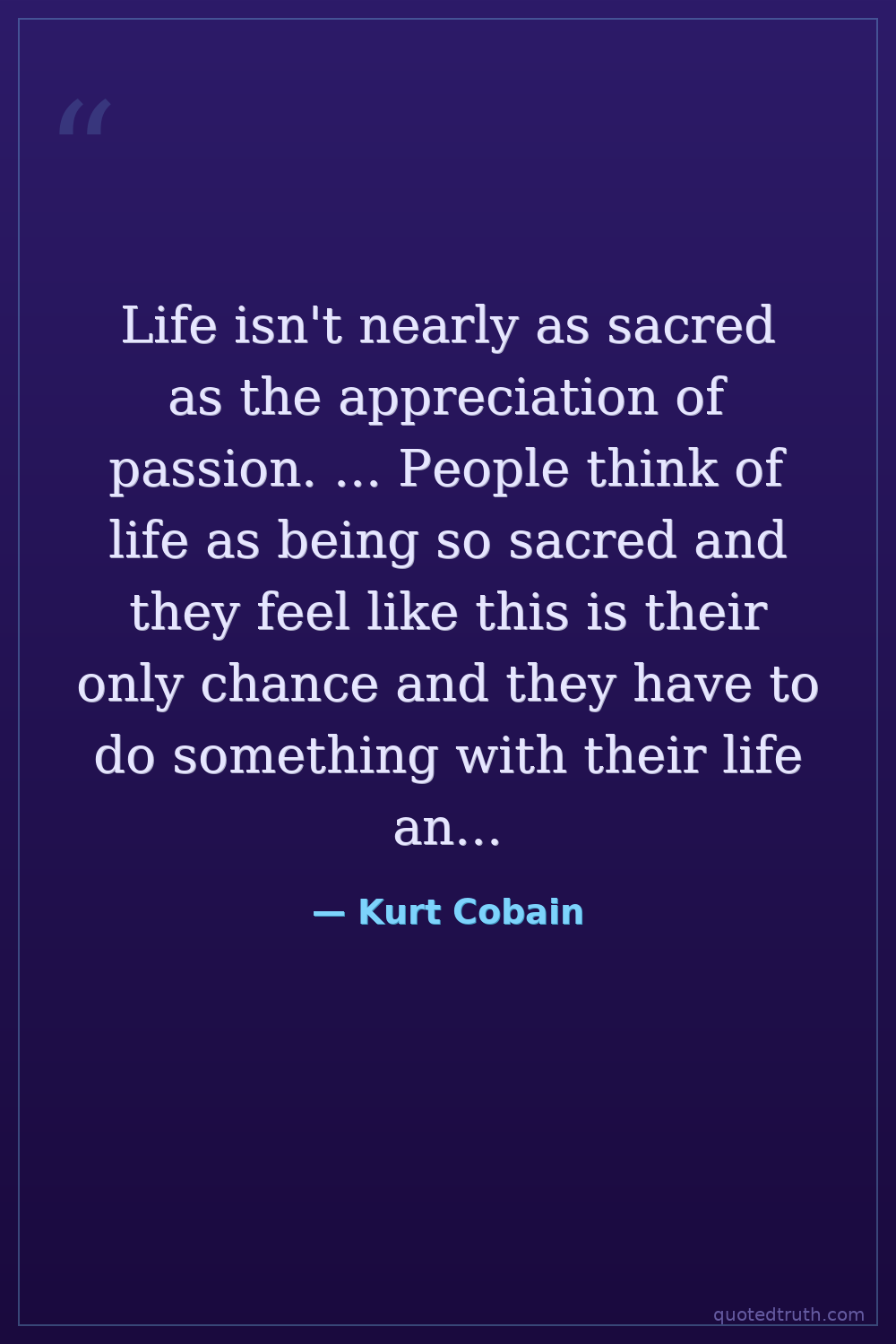 Life isn't nearly as sacred as the appreciation of passion. ... People think of life as being so sacred and they feel like this is their only chance and they have to do something with their life and make an impact As far as I'm concerned, it's just a pitstop for the afterlife. It's just a little test to see how you can handle reality.