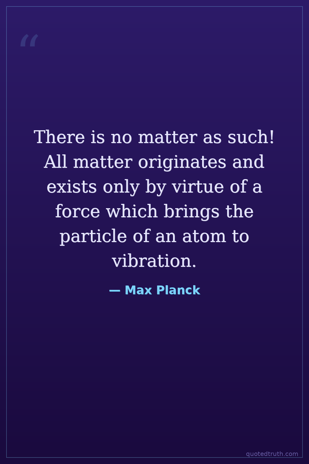 There is no matter as such! All matter originates and exists only by virtue of a force which brings the particle of an atom to vibration.