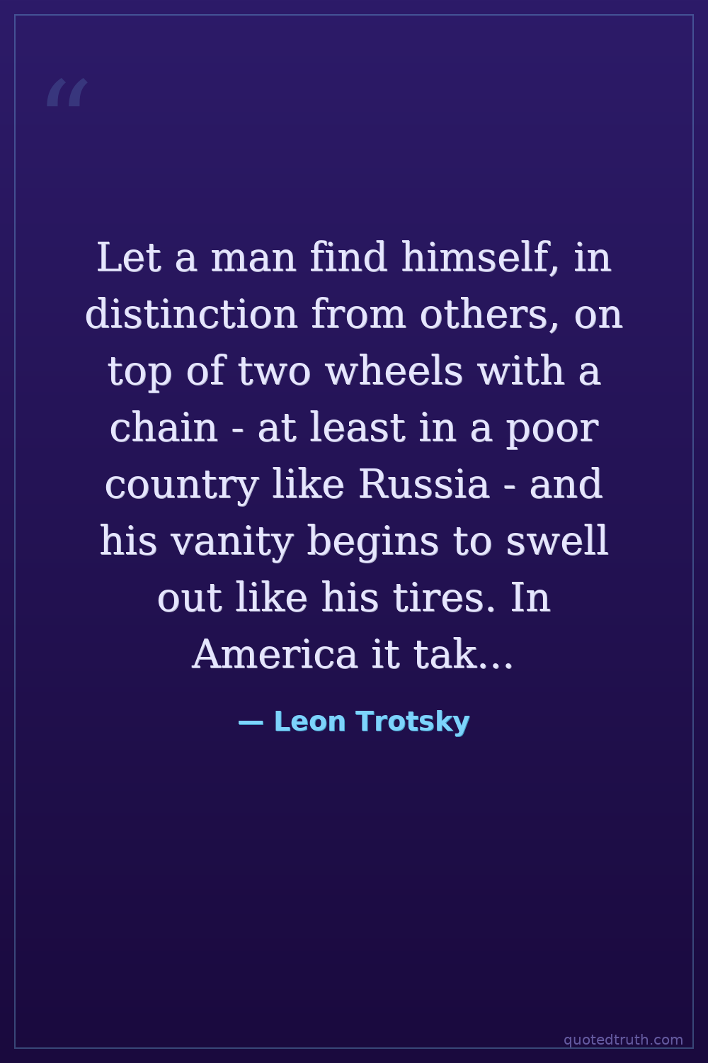 Let a man find himself, in distinction from others, on top of two wheels with a chain - at least in a poor country like Russia - and his vanity begins to swell out like his tires. In America it takes an automobile to produce this effect.
