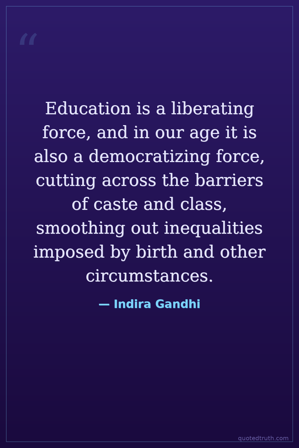 Education is a liberating force, and in our age it is also a democratizing force, cutting across the barriers of caste and class, smoothing out inequalities imposed by birth and other circumstances.