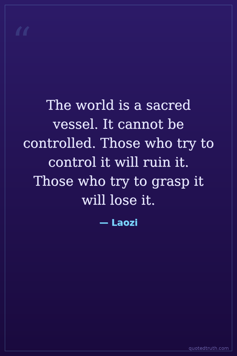 The world is a sacred vessel. It cannot be controlled. Those who try to control it will ruin it. Those who try to grasp it will lose it.