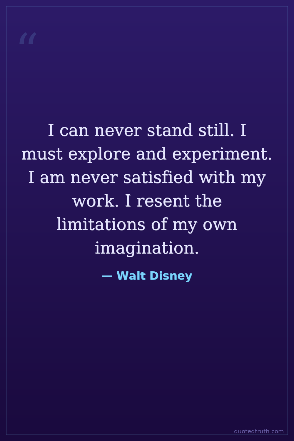 I can never stand still. I must explore and experiment. I am never satisfied with my work. I resent the limitations of my own imagination.