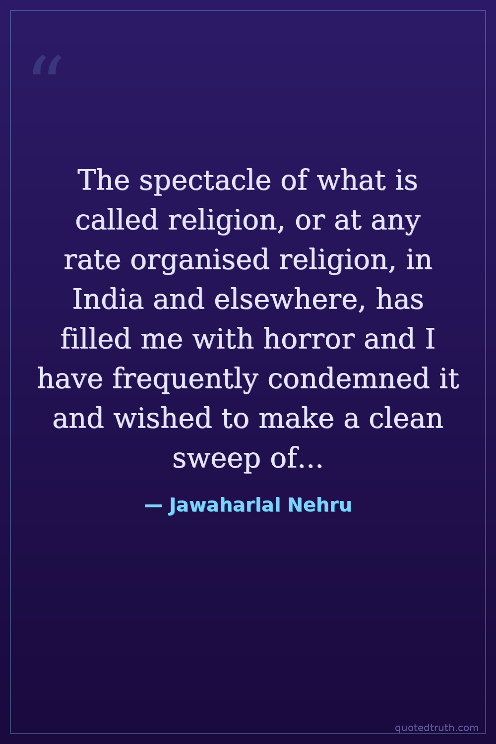The spectacle of what is called religion, or at any rate organised religion, in India and elsewhere, has filled me with horror and I have frequently condemned it and wished to make a clean sweep of it. Almost always it seemed to stand for blind belief and reaction, dogma and bigotry, superstition, exploitation and the preservation of vested interests.