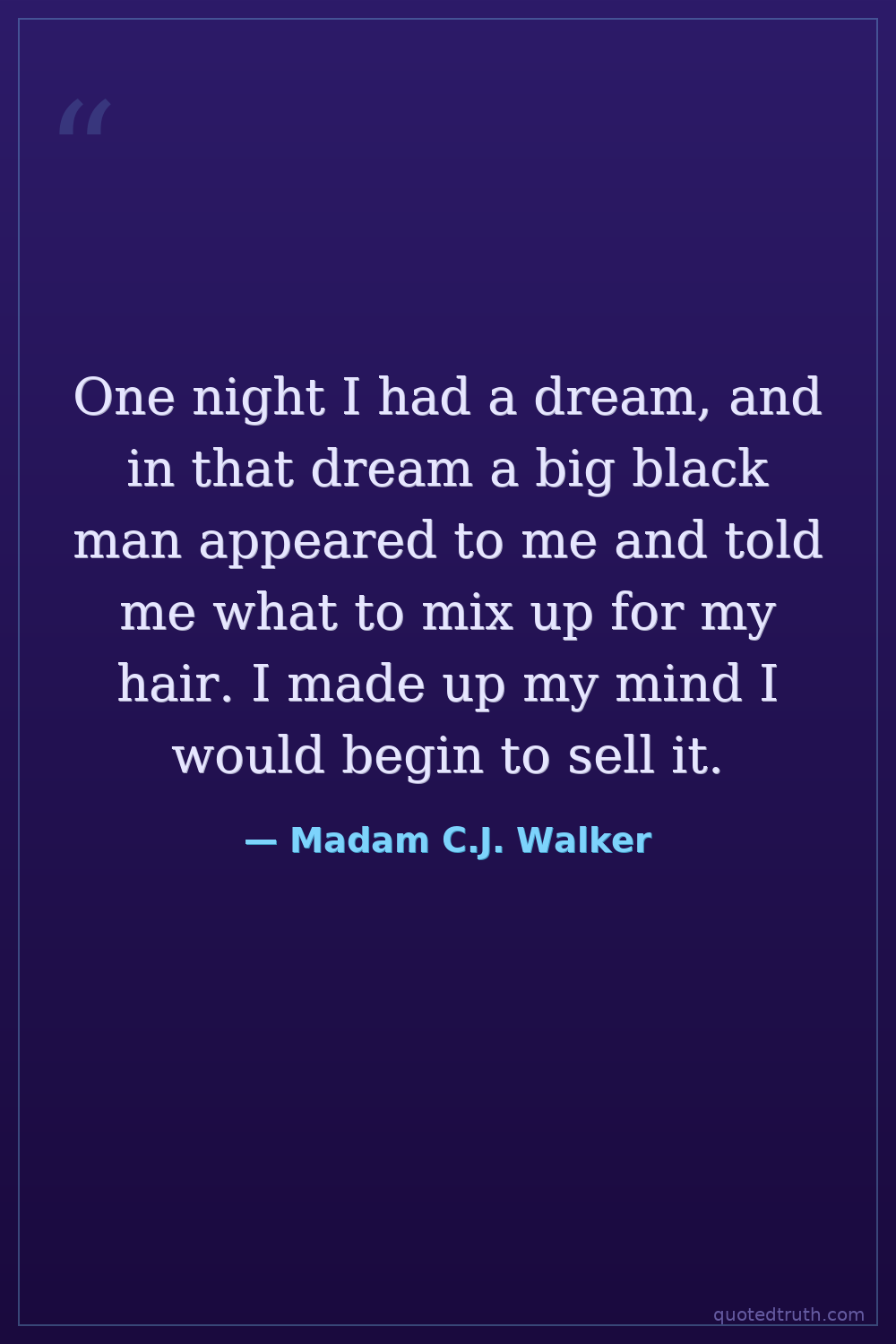 One night I had a dream, and in that dream a big black man appeared to me and told me what to mix up for my hair. I made up my mind I would begin to sell it.
