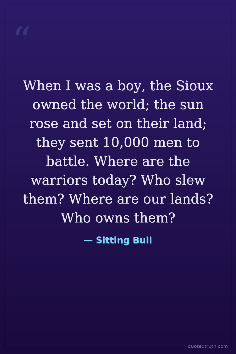 When I was a boy, the Sioux owned the world; the sun rose and set on their land; they sent 10,000 men to battle. Where are the warriors today? Who slew them? Where are our lands? Who owns them?