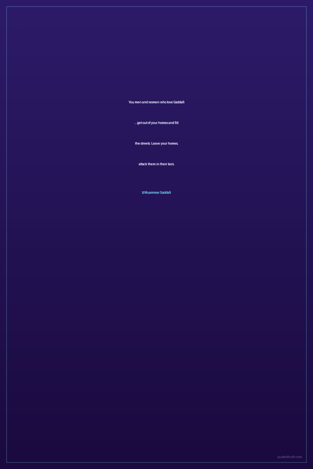 You men and women who love Gaddafi … get out of your homes and fill the streets. Leave your homes; attack them in their lairs.