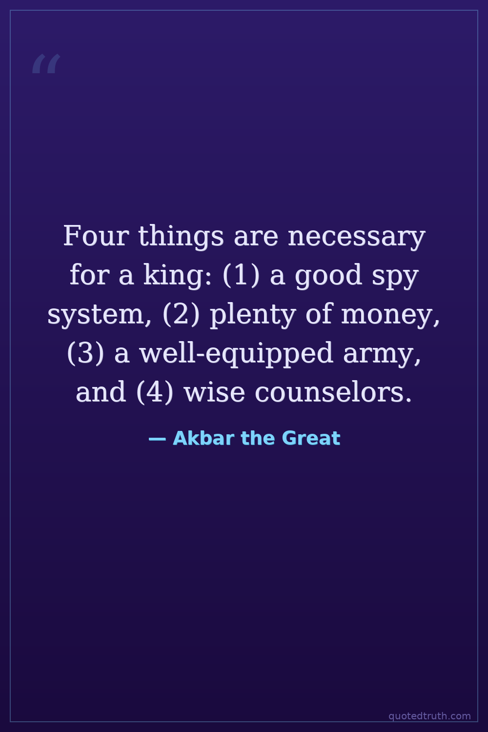 Four things are necessary for a king: (1) a good spy system, (2) plenty of money, (3) a well-equipped army, and (4) wise counselors.