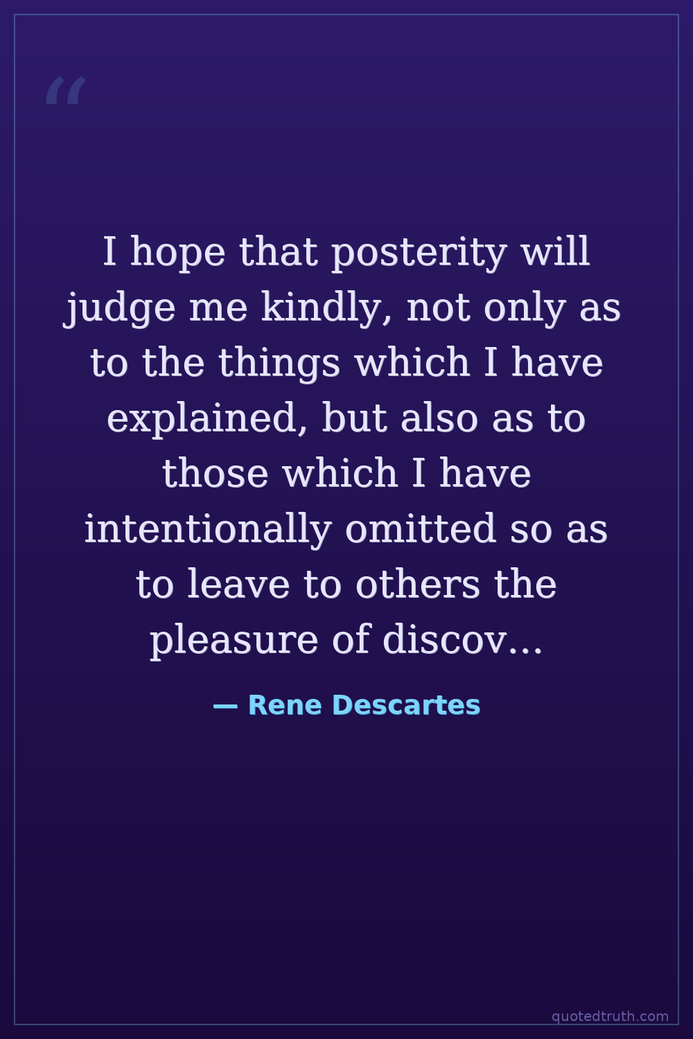 I hope that posterity will judge me kindly, not only as to the things which I have explained, but also as to those which I have intentionally omitted so as to leave to others the pleasure of discovery.