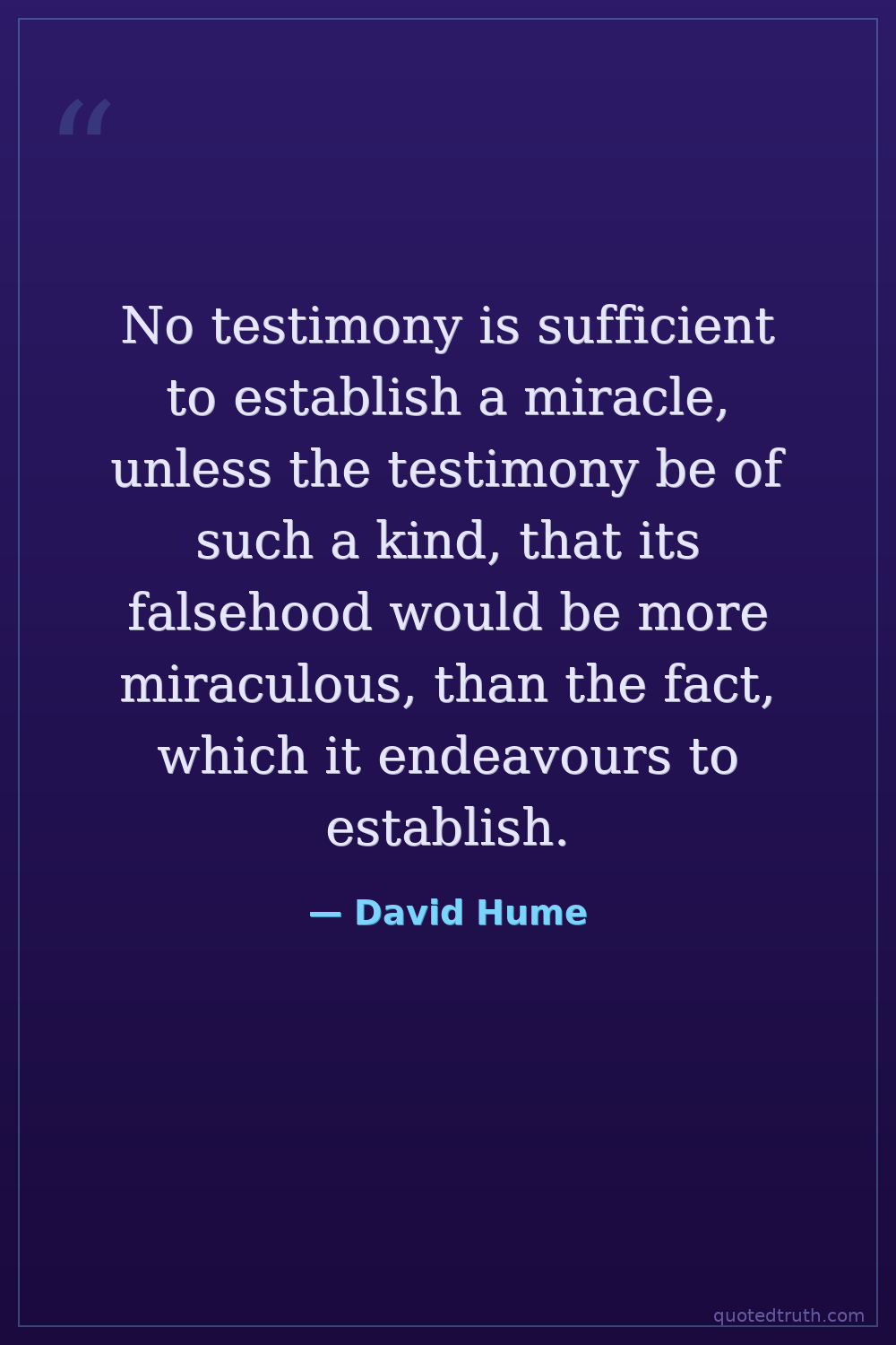 No testimony is sufficient to establish a miracle, unless the testimony be of such a kind, that its falsehood would be more miraculous, than the fact, which it endeavours to establish.