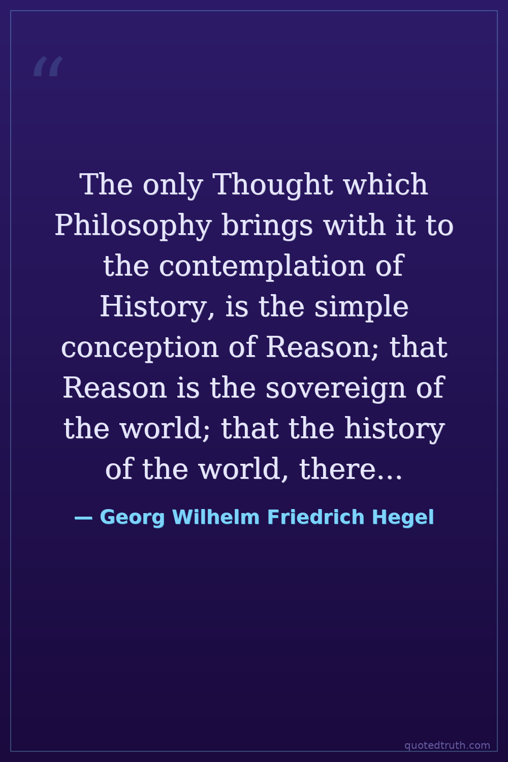 The only Thought which Philosophy brings with it to the contemplation of History, is the simple conception of Reason; that Reason is the sovereign of the world; that the history of the world, therefore, presents us with a rational process.