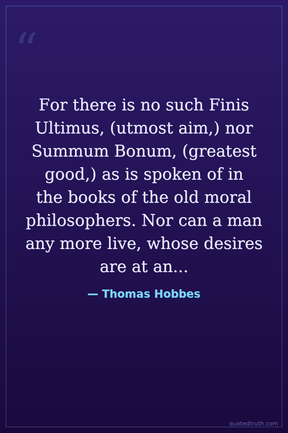 For there is no such Finis Ultimus, (utmost aim,) nor Summum Bonum, (greatest good,) as is spoken of in the books of the old moral philosophers. Nor can a man any more live, whose desires are at an end, than he whose senses and imaginations are at a stand. Felicity is a continual progress of the desire, from one object to another; the attaining of the former, being still but the way to the latter.