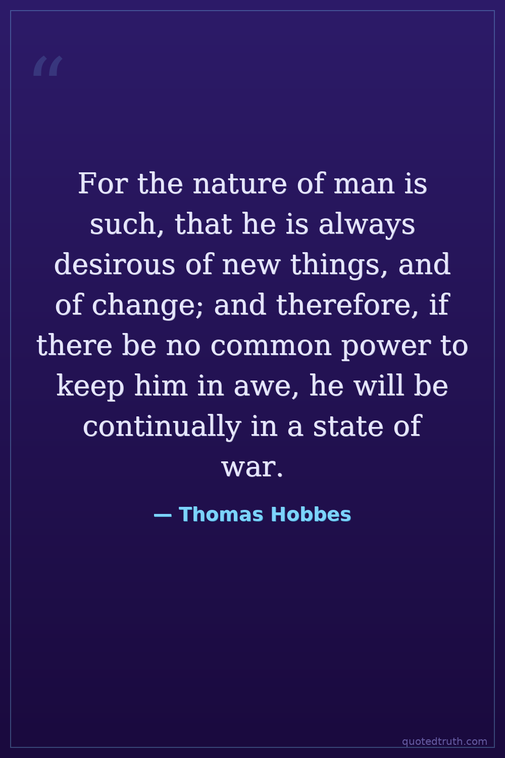 For the nature of man is such, that he is always desirous of new things, and of change; and therefore, if there be no common power to keep him in awe, he will be continually in a state of war.