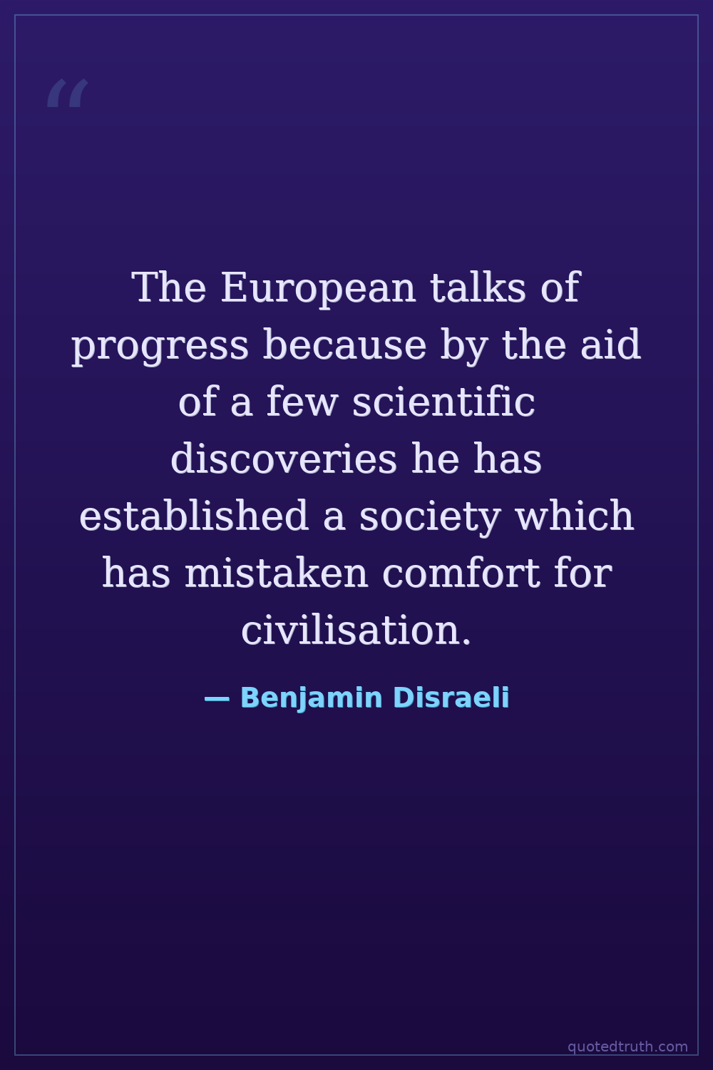The European talks of progress because by the aid of a few scientific discoveries he has established a society which has mistaken comfort for civilisation.