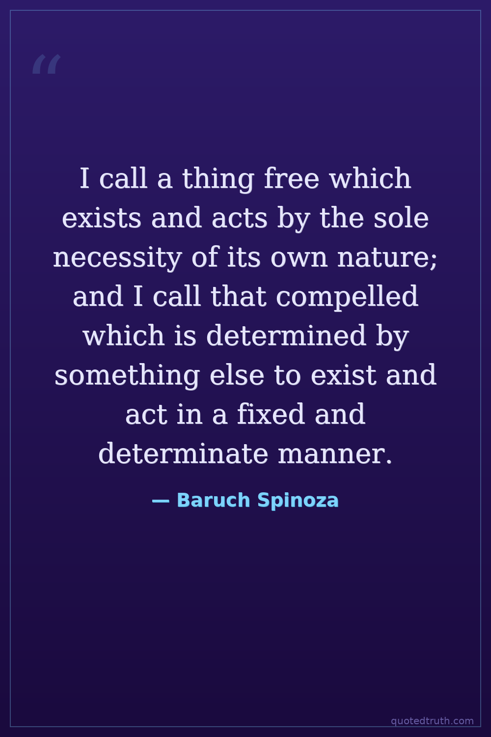 I call a thing free which exists and acts by the sole necessity of its own nature; and I call that compelled which is determined by something else to exist and act in a fixed and determinate manner.