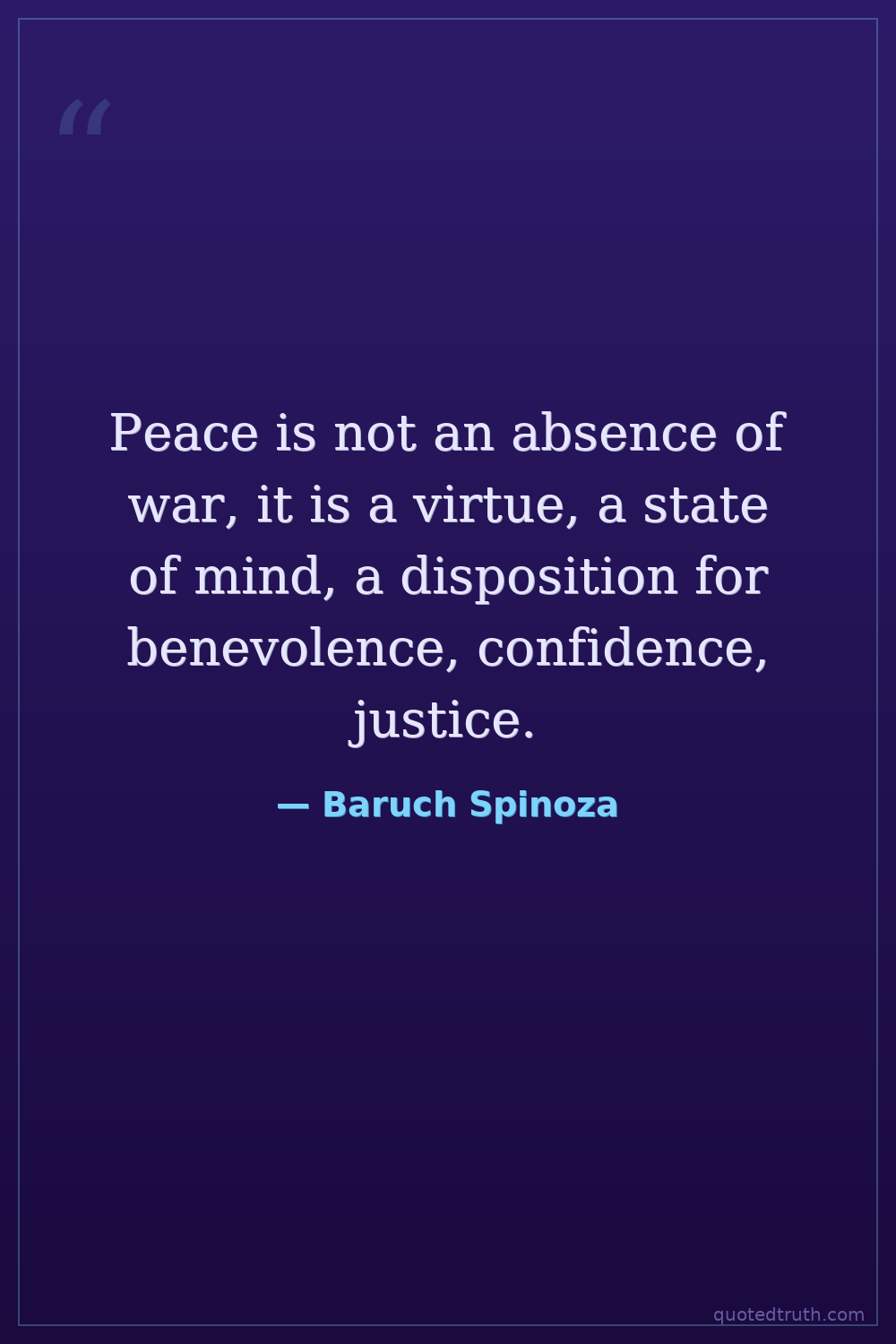 Peace is not an absence of war, it is a virtue, a state of mind, a disposition for benevolence, confidence, justice.