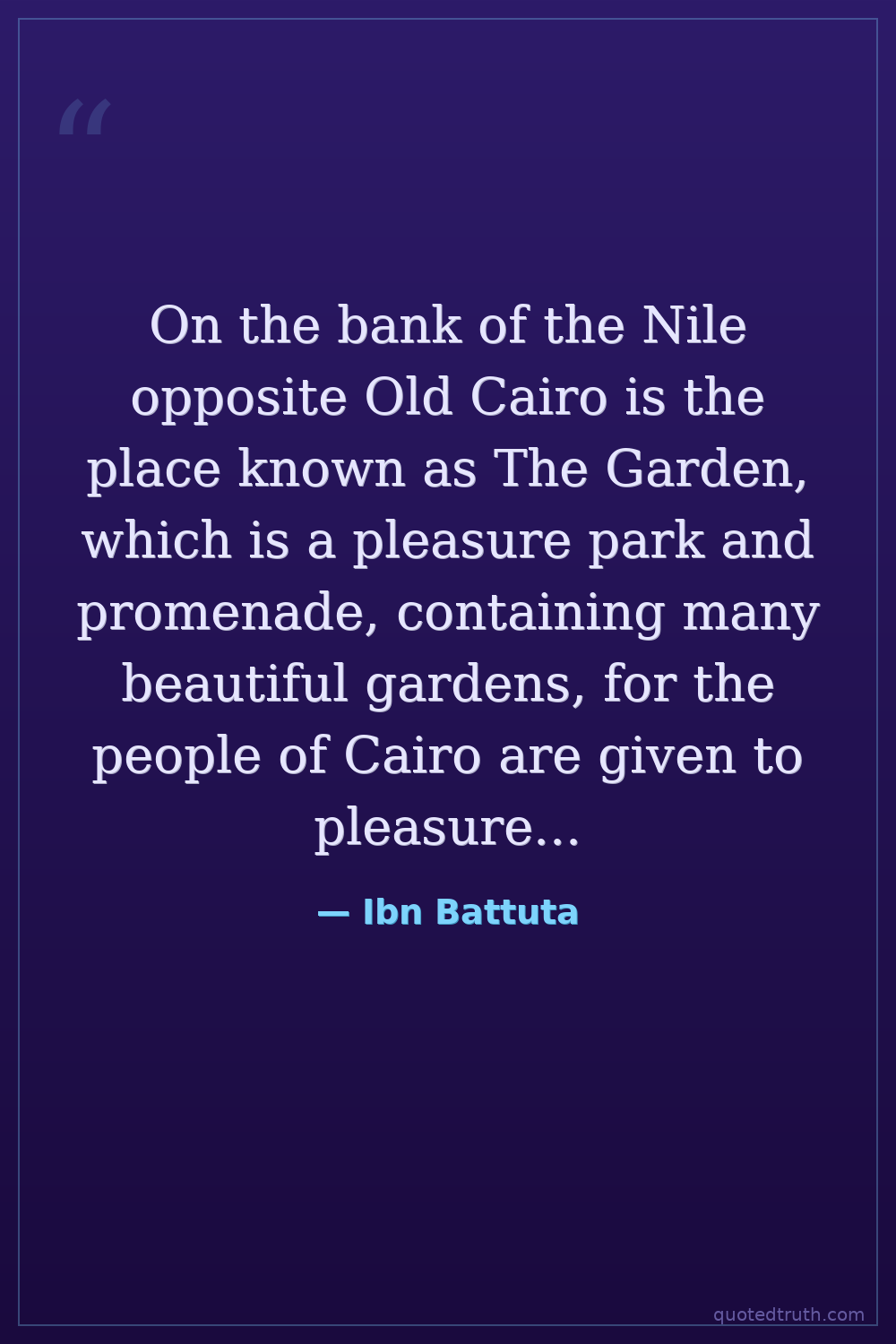 On the bank of the Nile opposite Old Cairo is the place known as The Garden, which is a pleasure park and promenade, containing many beautiful gardens, for the people of Cairo are given to pleasure and amusements. I witnessed a fete once in Cairo for the sultan's recovery from a fractured hand; all the merchants decorated their bazaars and had rich stuffs, ornaments and silken fabrics hanging in their shops for several days.