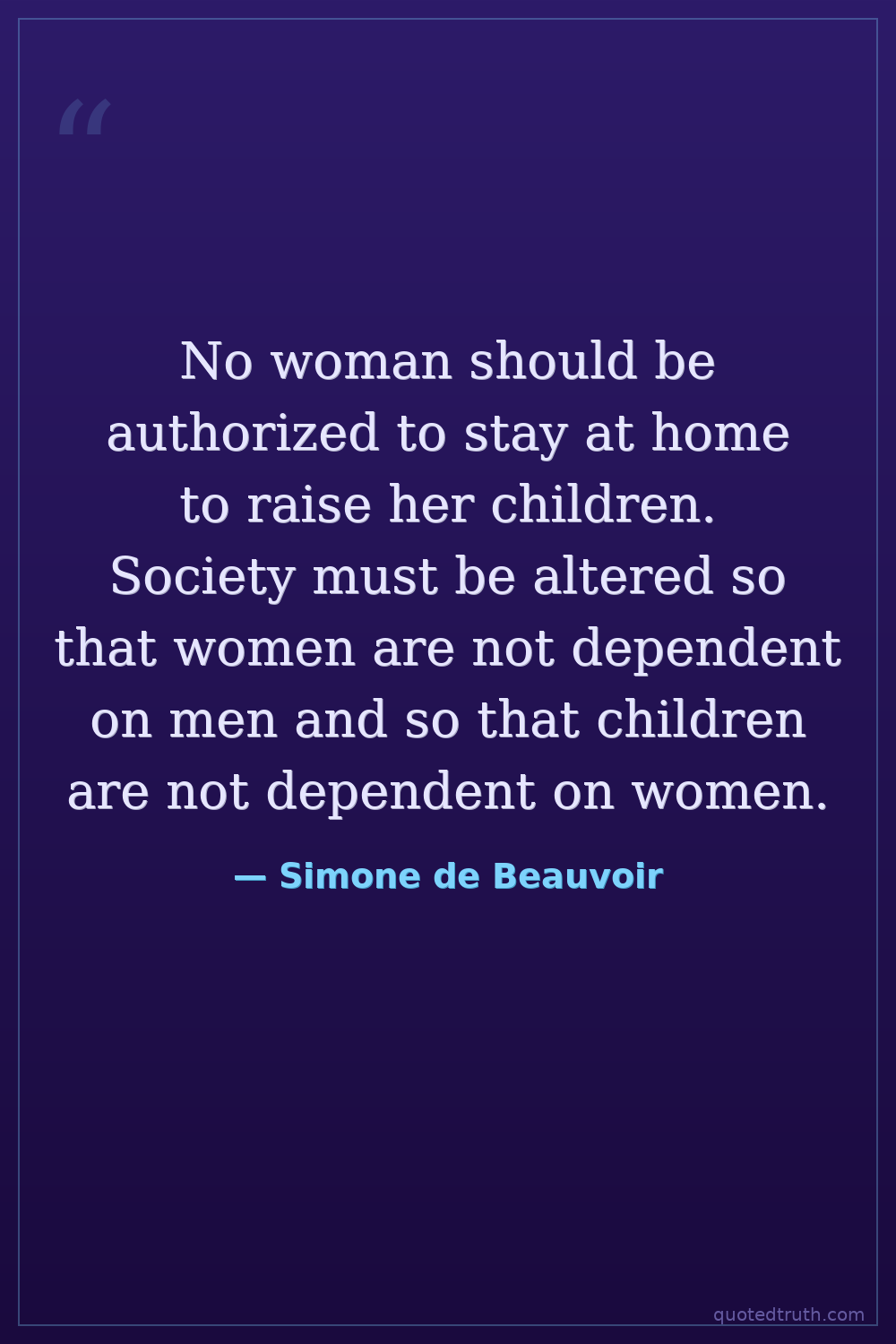 No woman should be authorized to stay at home to raise her children. Society must be altered so that women are not dependent on men and so that children are not dependent on women.