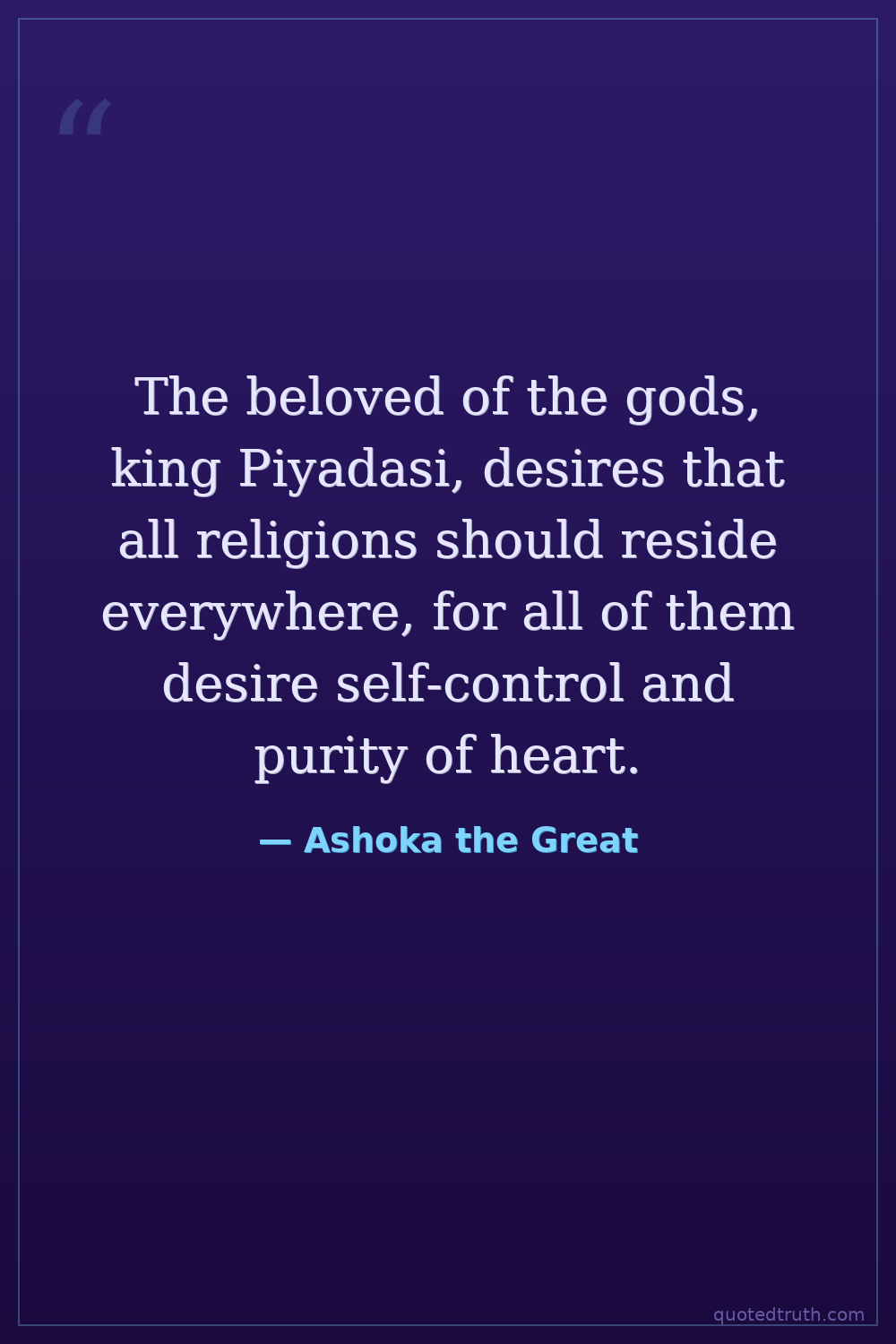 The beloved of the gods, king Piyadasi, desires that all religions should reside everywhere, for all of them desire self-control and purity of heart.
