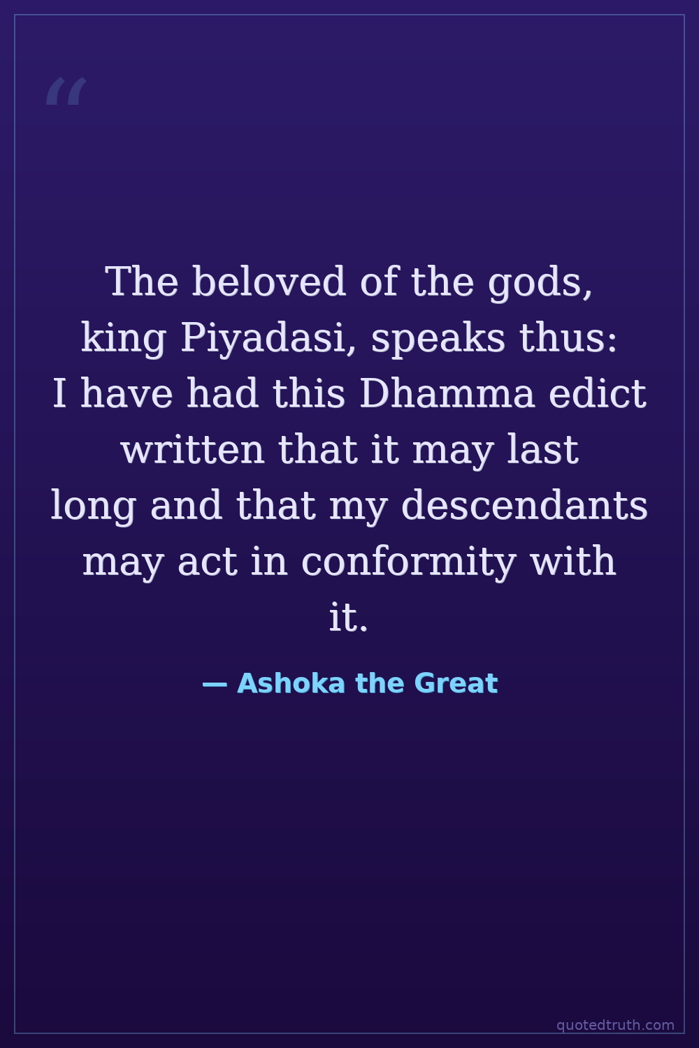The beloved of the gods, king Piyadasi, speaks thus: I have had this Dhamma edict written that it may last long and that my descendants may act in conformity with it.